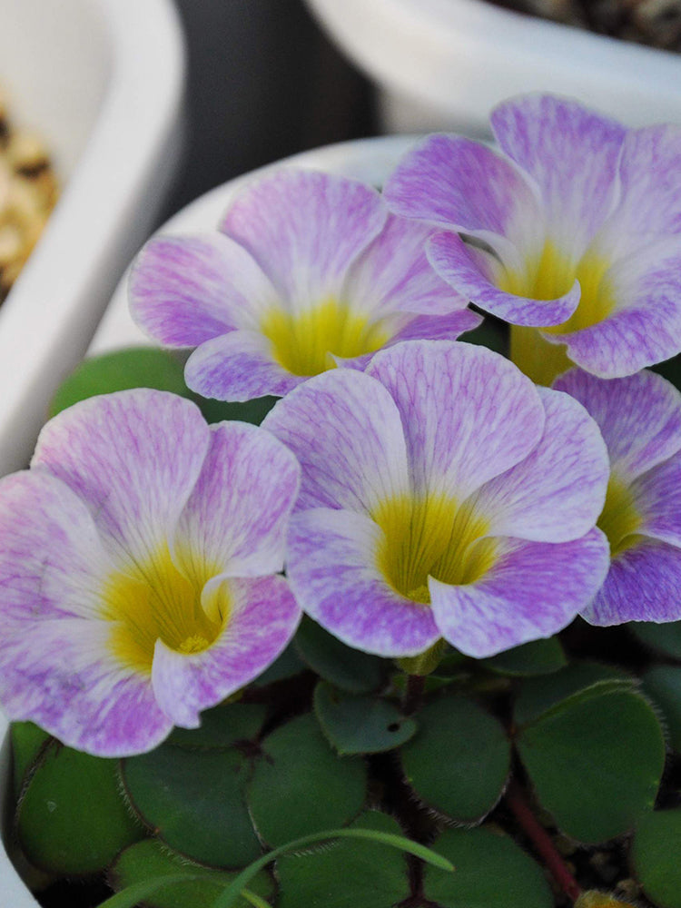 The 'Hybrids' variety of Oxalis obtusa showcases exquisite blossoms, each petal a delicate blend of soft lavender-purple and pristine white. Fine, darker purple veins radiate outwards from the vibrant yellow-gold center, creating a captivating starburst effect. The combination of the cool purple and warm yellow hues makes these flowers a truly charming addition to any collection, offering a cheerful and elegant display.