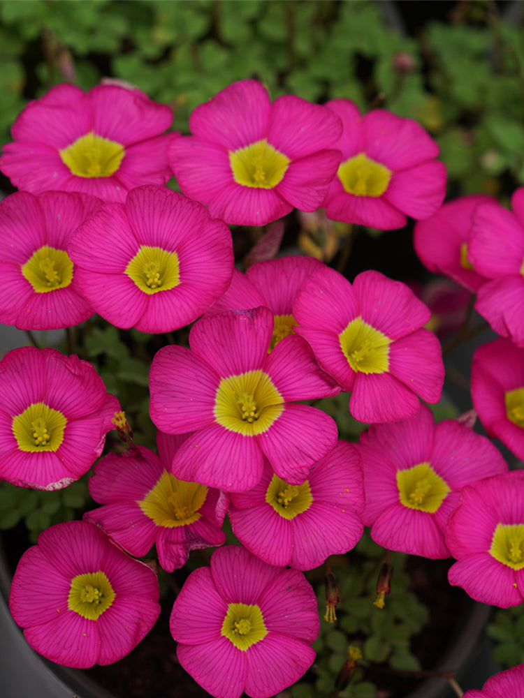 Oxalis obtusa 'Ruby' showcases stunning, vibrant magenta-pink blossoms, each featuring a striking bright yellow center. The rich, fuchsia-like petals create a captivating contrast with the sunny heart, making these flowers truly eye-catching. The abundance of these cheerful blooms forms a lush, colorful display that will brighten any space.