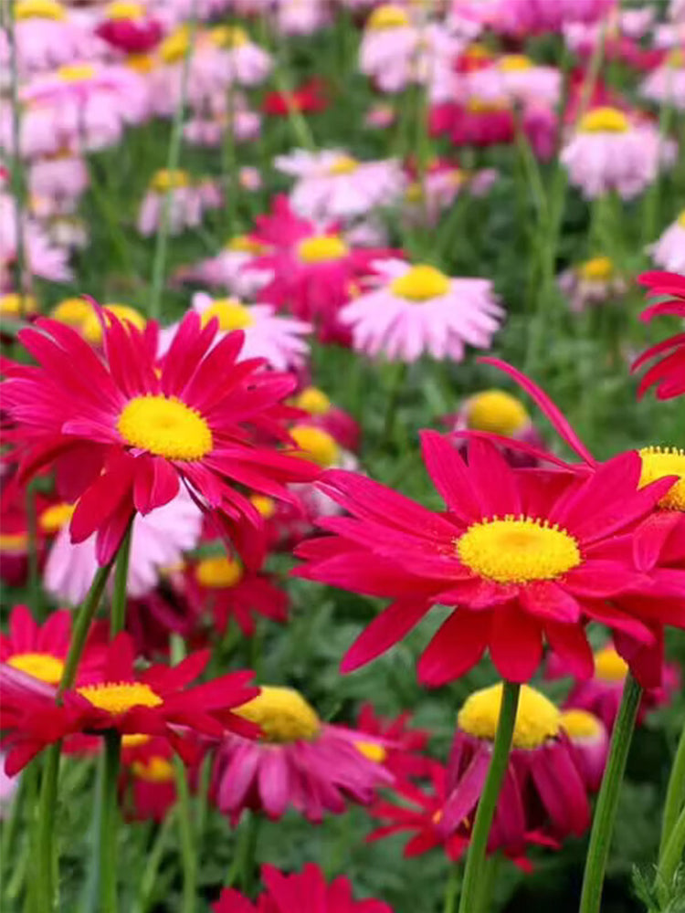 - Painted Daisy (Tanacetum coccineum) is a perennial herbaceous plant of the Asteraceae family, growing 25-50 cm tall. It has a short rhizome and an erect stem. Its basal leaves are ovate or oblong, bipinnately divided, with terminal lobes elliptical, oblong, or obliquely triangular. The capitula are solitary or paired at the top of the stem, with lanceolate bracts. Flowering and fruiting occur from May to October.