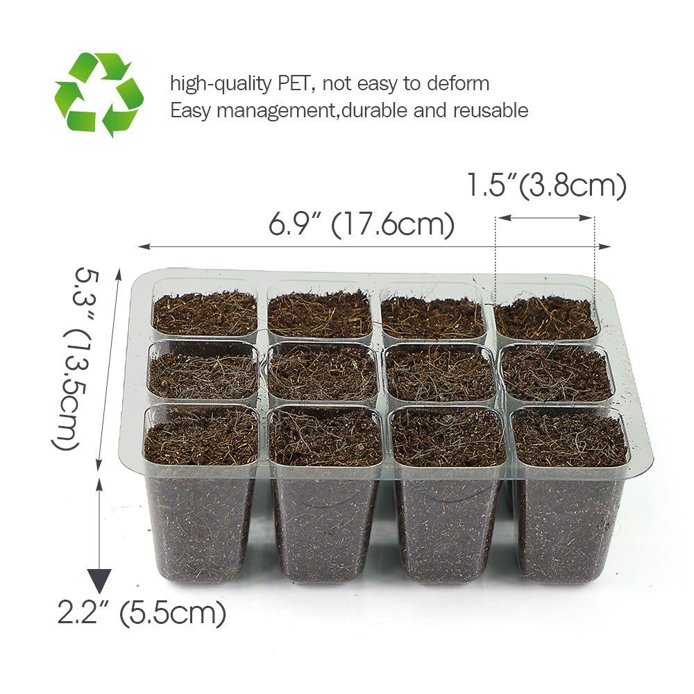🌱【Quantity & Size】Introducing our PET 12-Cell Transparent Seedling Starting Tray, Pack of 10 - the perfect solution for starting your seeds on a budget. Each cell has dimensions of 1.5''x1.5'' (3.8x3.8cm) and the trays' outer dimensions are 6.9'' L x 5.3'' W x 2.2'' H (17.6x13.5x5.5cm).