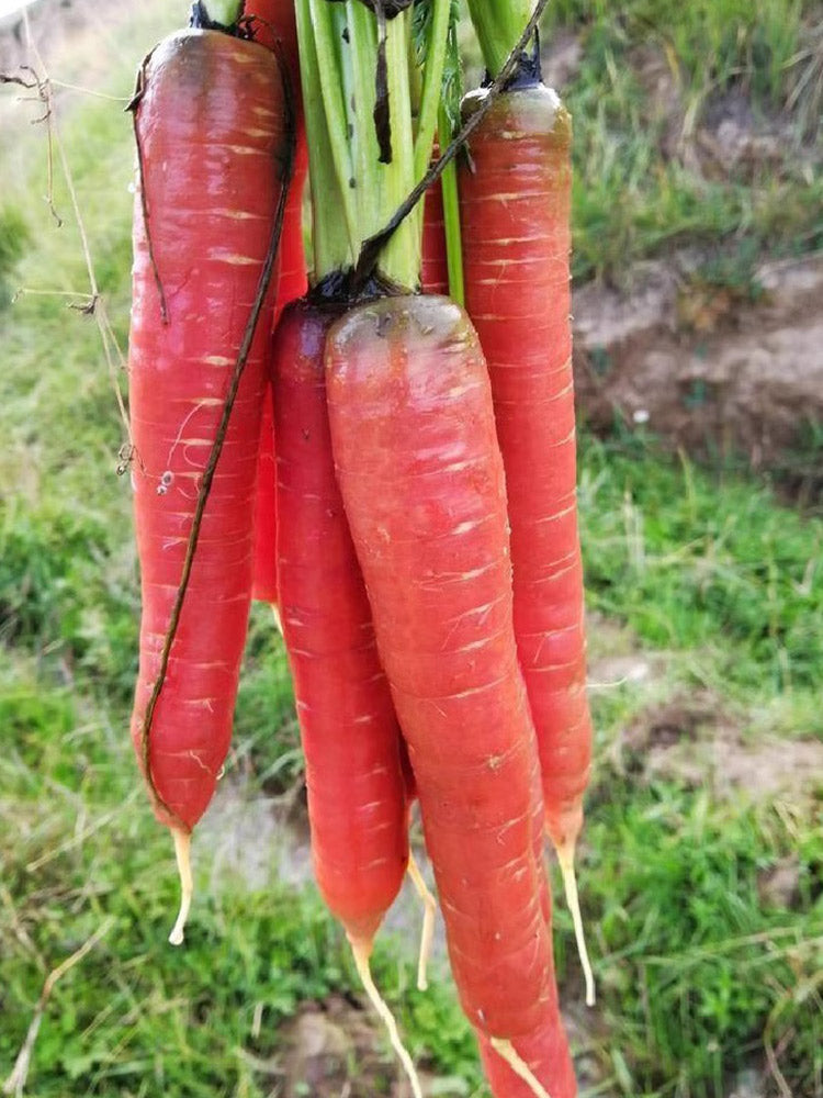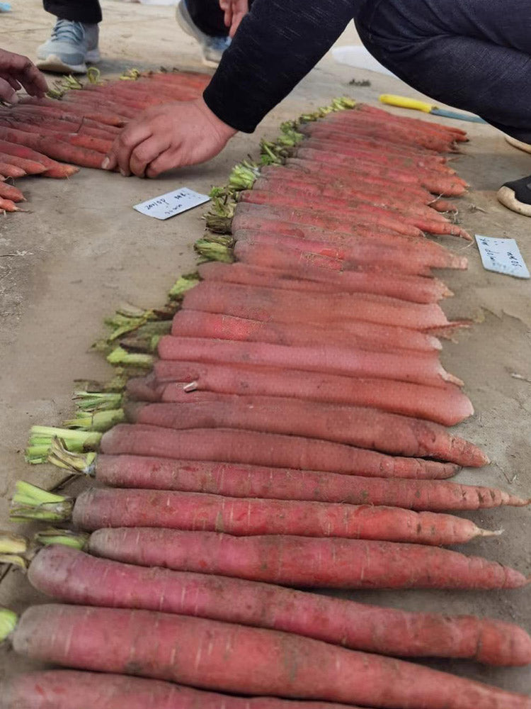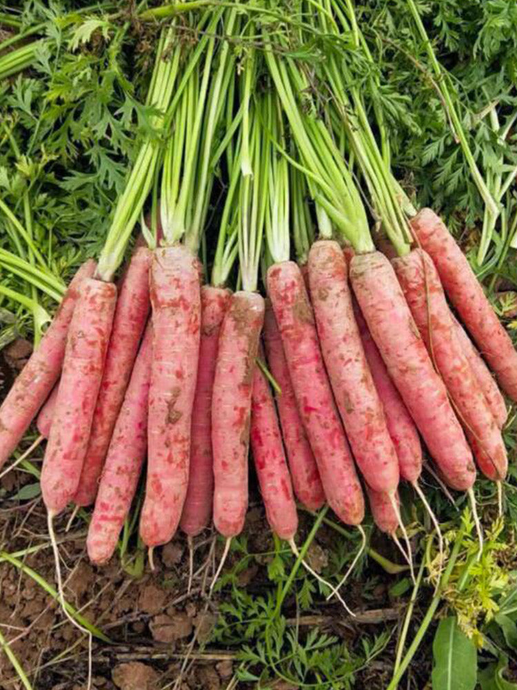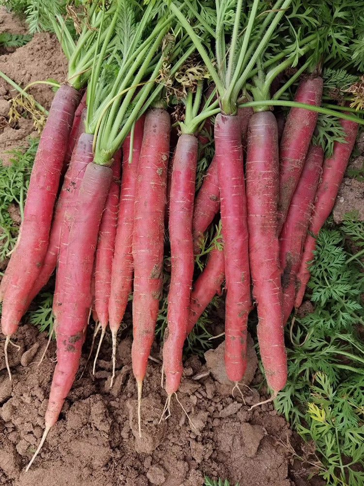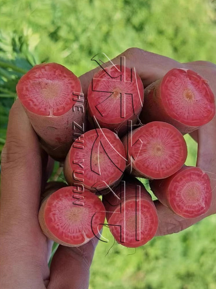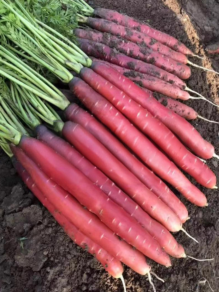 This is an excellent purple-red carrot variety. The roots are nearly cylindrical, with uniform heads and tails, smooth, glossy skin, approximately 28 cm long and 3-4 cm in diameter, and exceptional commercial quality. The fruit has low moisture content and a strong carrot aroma, making it the top choice for base cultivation.