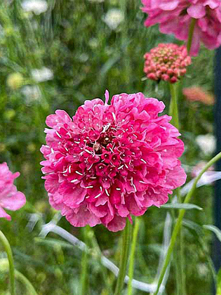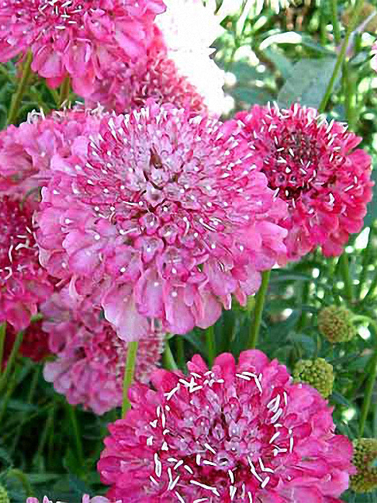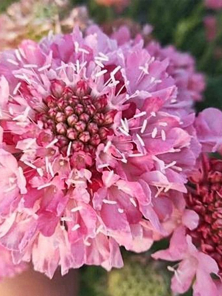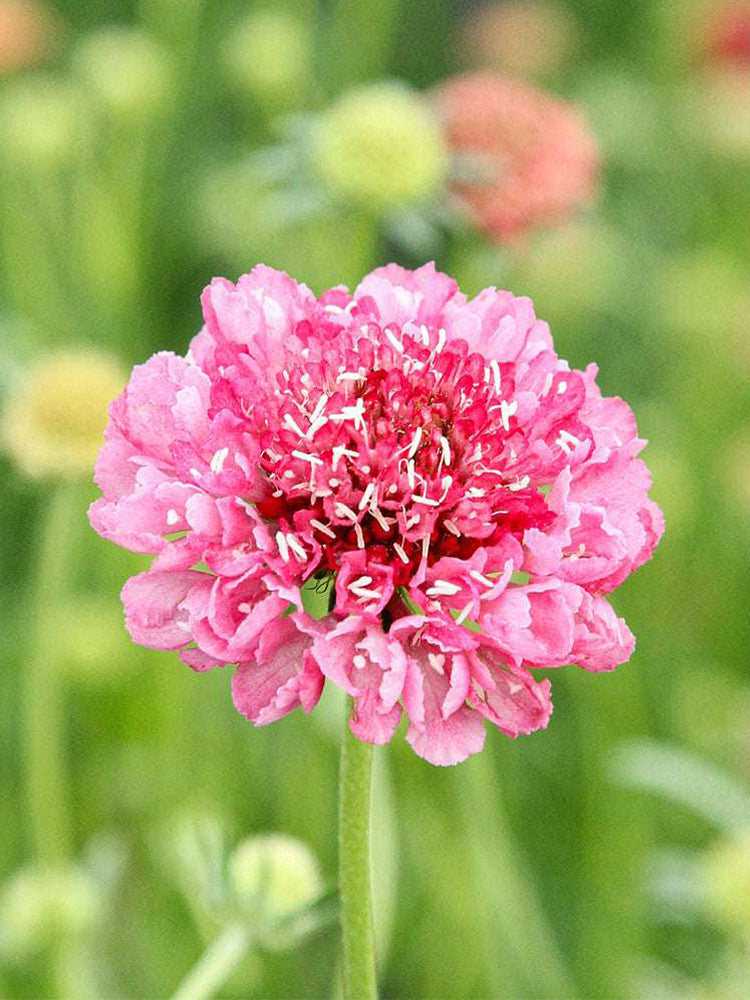 - Pincushion flower (scientific name: Scabiosa atropurpurea) is an annual or biennial herbaceous plant of the genus Scabiosa in the family Caprifoliaceae (formerly Dipsaciaceae), native to southern Europe. It grows 30-60 cm tall with smooth, branched stems. Its basal leaves are nearly spoon-shaped, and the stem leaves are opposite, deeply to completely pinnately lobed, sparsely covered with long, white hairs. The capitula are terminal, with radially arranged florets along the margins. The corolla is 4-5 lobed and rich in color. The flowering period typically occurs from May to June or August to October, and is long-lasting. This plant is cold-tolerant but intolerant of hot, humid environments. It thrives in well-drained, loose, fertile, neutral soil. Propagation is primarily by sowing in autumn (sowing in either spring or autumn is acceptable), with an optimum germination temperature of 15-20℃. Due to its high ornamental value, it is widely used in flower beds, borders, and cut flower cultivation.