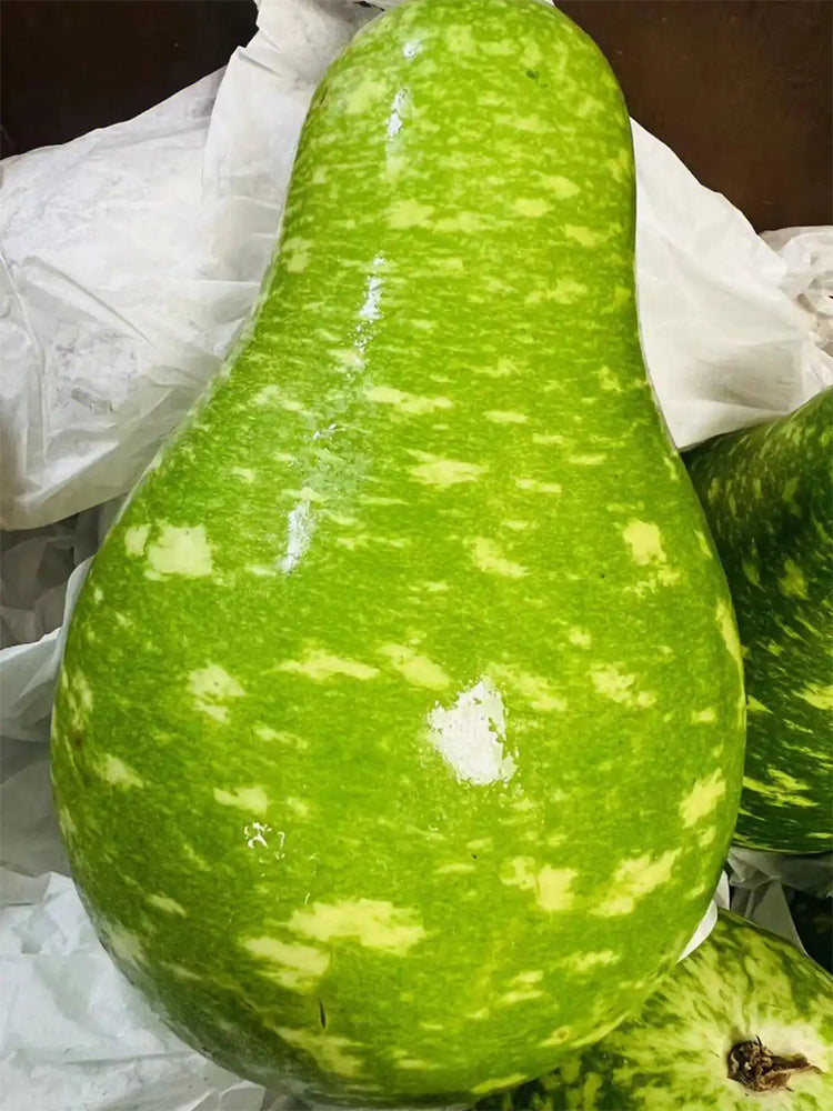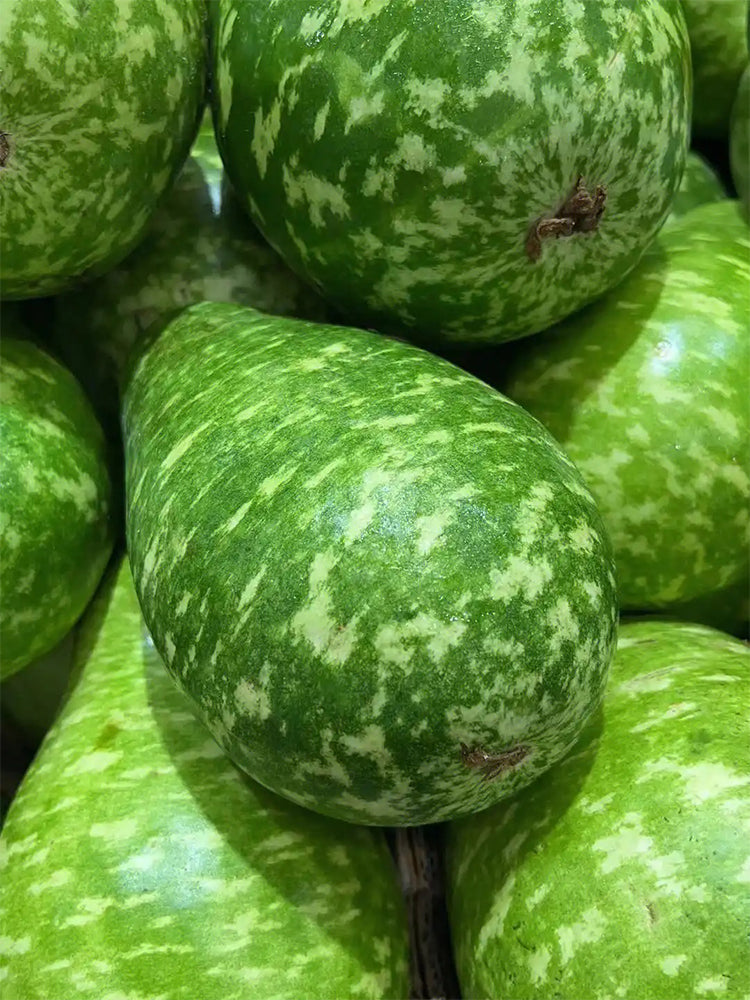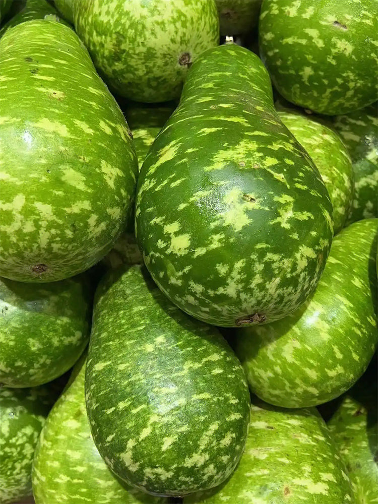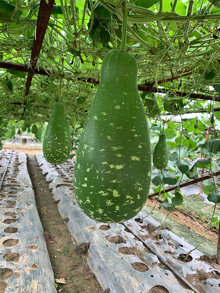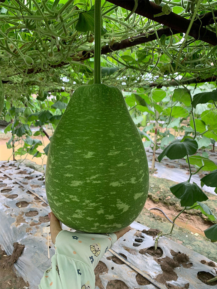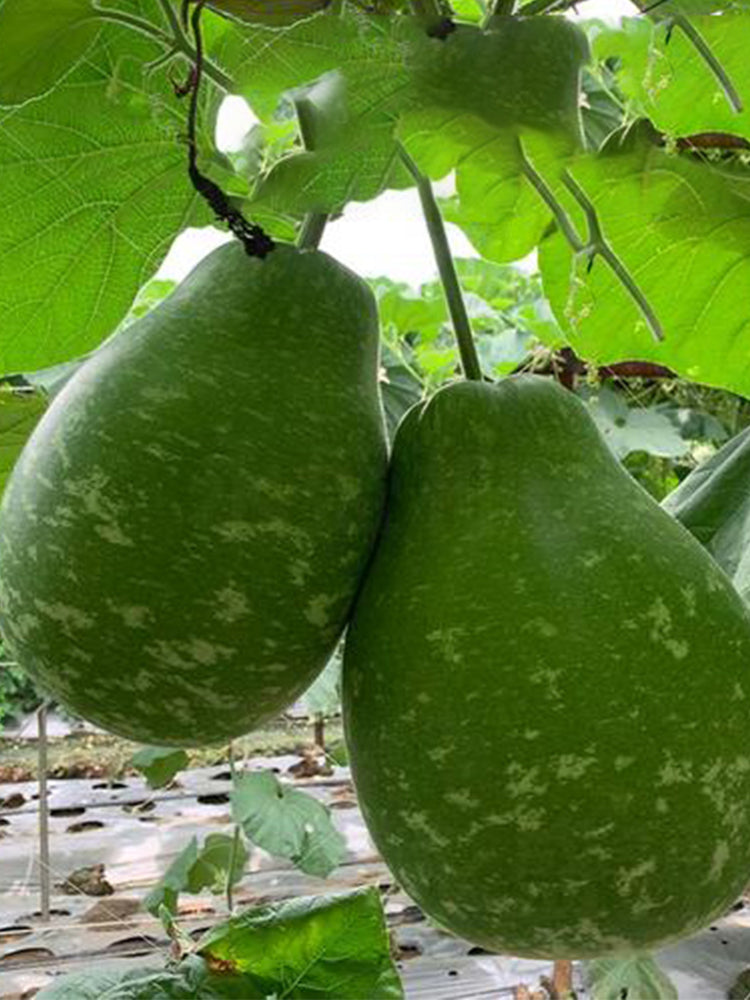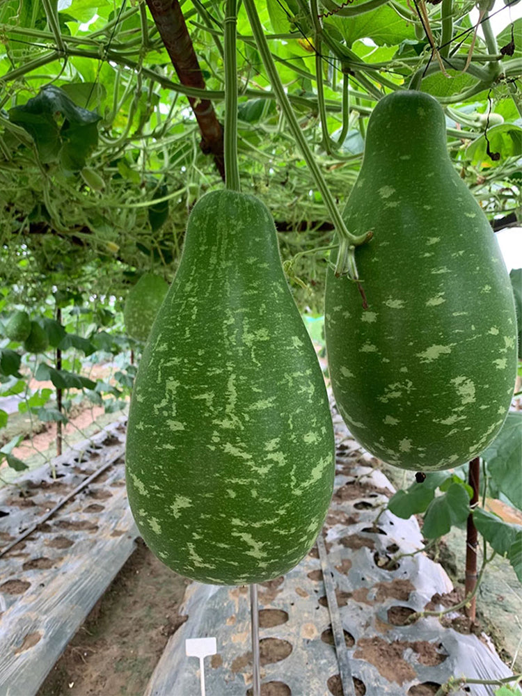 - This variety is moderately early-maturing and has strong growth vigor. The fruit is in a high conical shape. Its skin is green with a variegated pattern, and the shape of the melon is aesthetically pleasing. The length of the melon is approximately 25 centimeters, and the weight of a single melon is about 500 grams. The flesh is tender and white, and the quality is excellent. From sowing in spring to the first harvest, it takes about 50 days, and from sowing in autumn, it takes about 35 days. It mainly bears fruits on the sub-vines and grandchild vines, with a per-mu yield of about 4,500 kilograms.