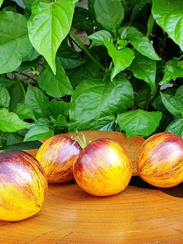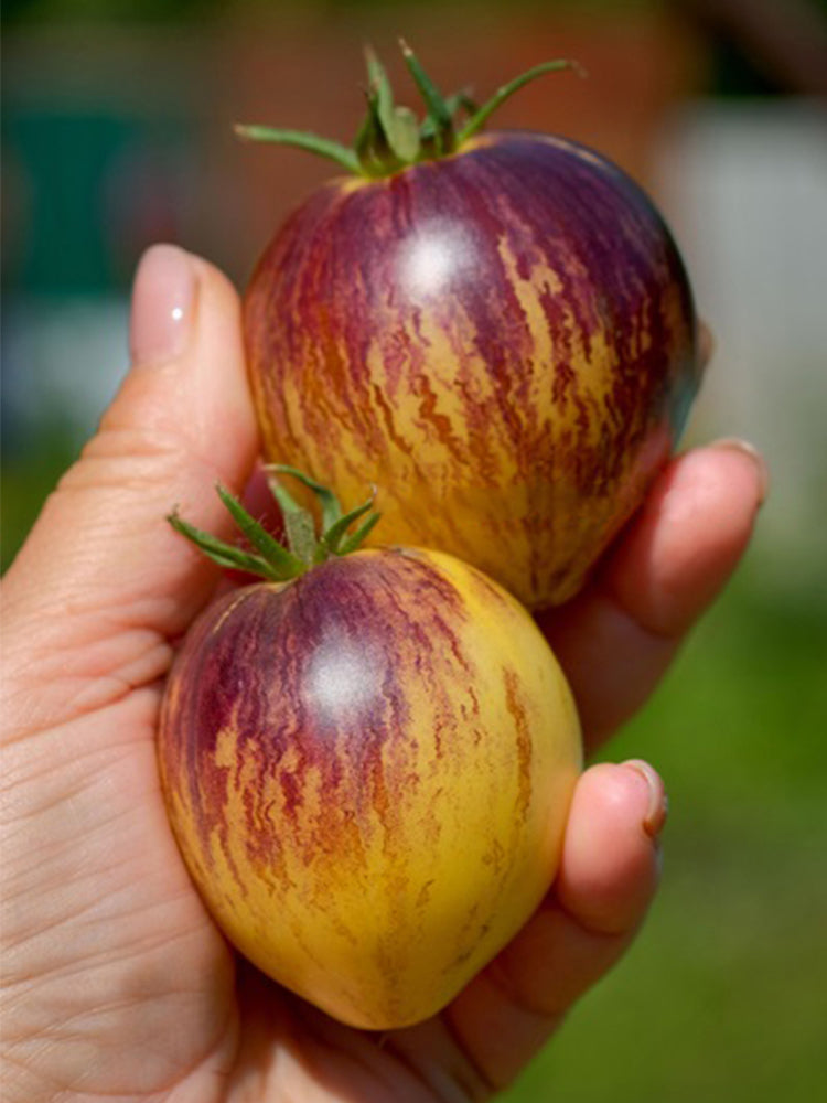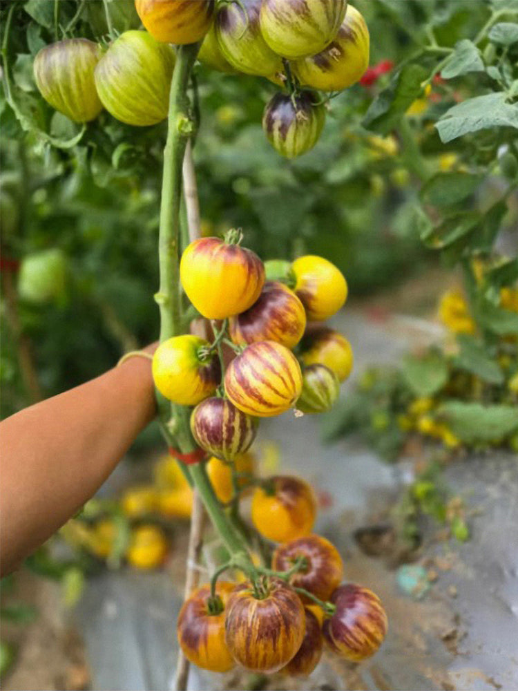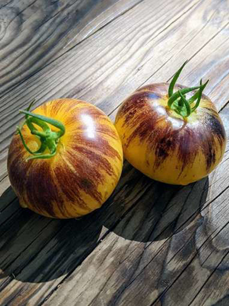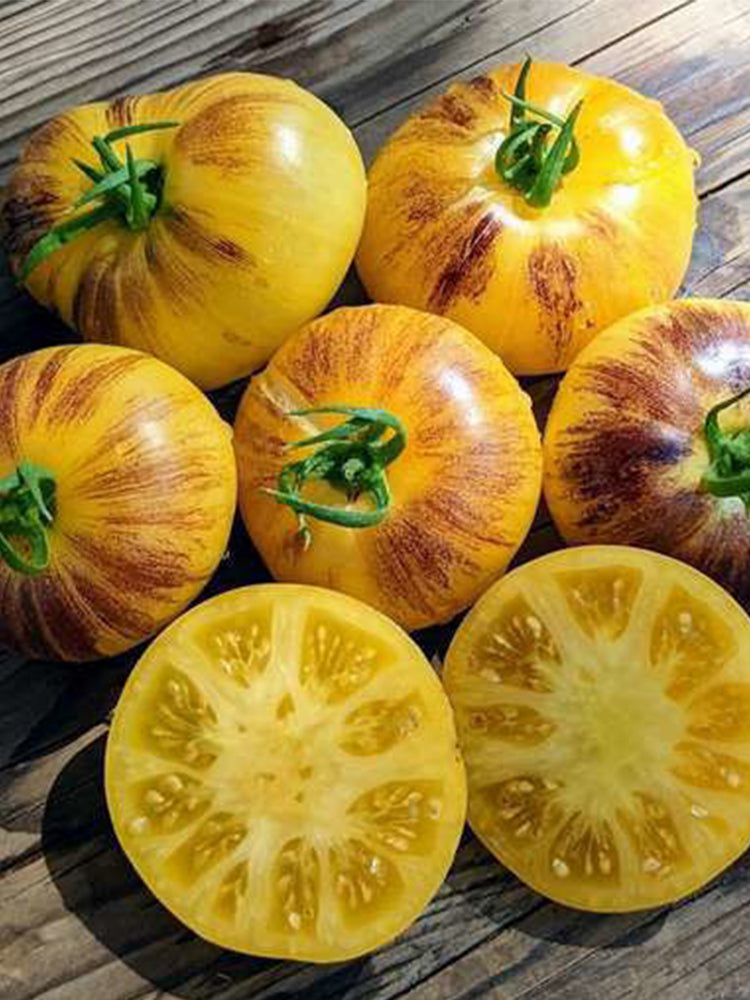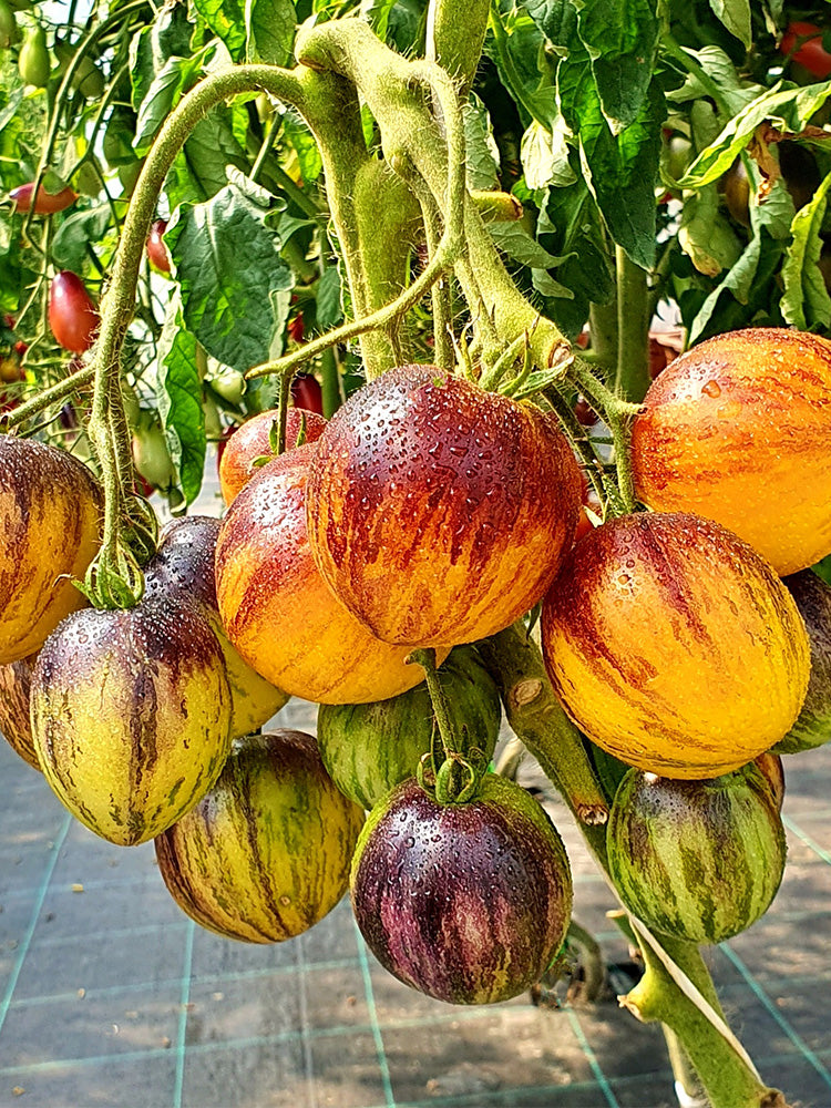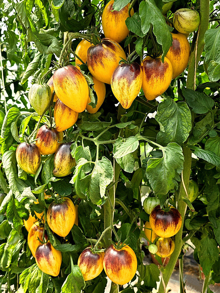 - "Rebel Starfighter Kayleigh Anne" is a medium-early indeterminate tomato hybrid, producing vigorous tall plants with regular foliage. Its crack-resistant, heart-shaped fruits (150-260g) develop golden yellow skin with striking purple-black striping on the shoulders, bearing resemblance to pepino dulce (Solanum muricatum). The anthocyanin-rich fruits deliver exceptional flavor—a balance of intense sweetness and mild acidity, with juicy texture and layered fruity notes. Perfect for fresh markets, they also elevate gourmet presentations.