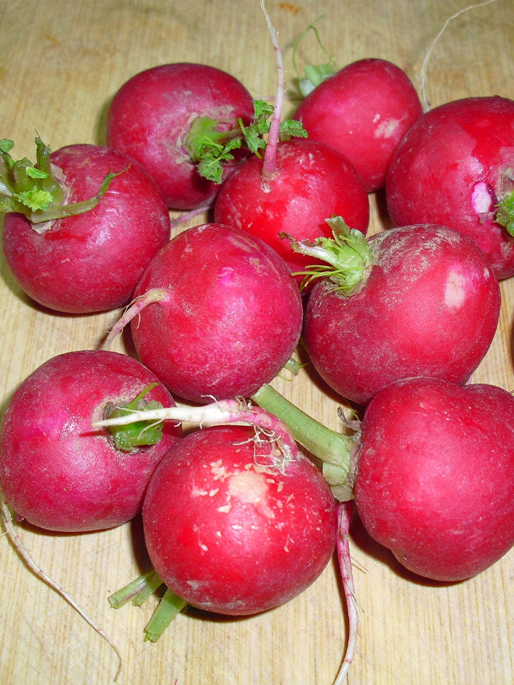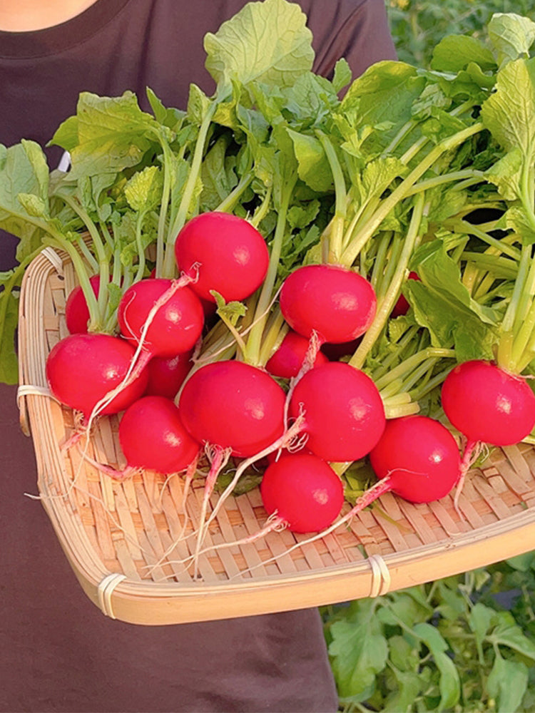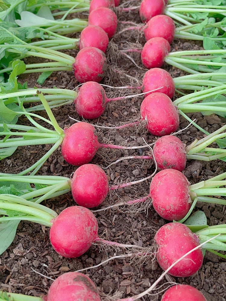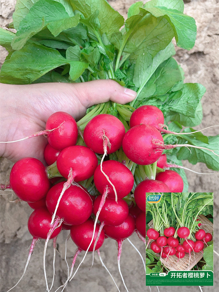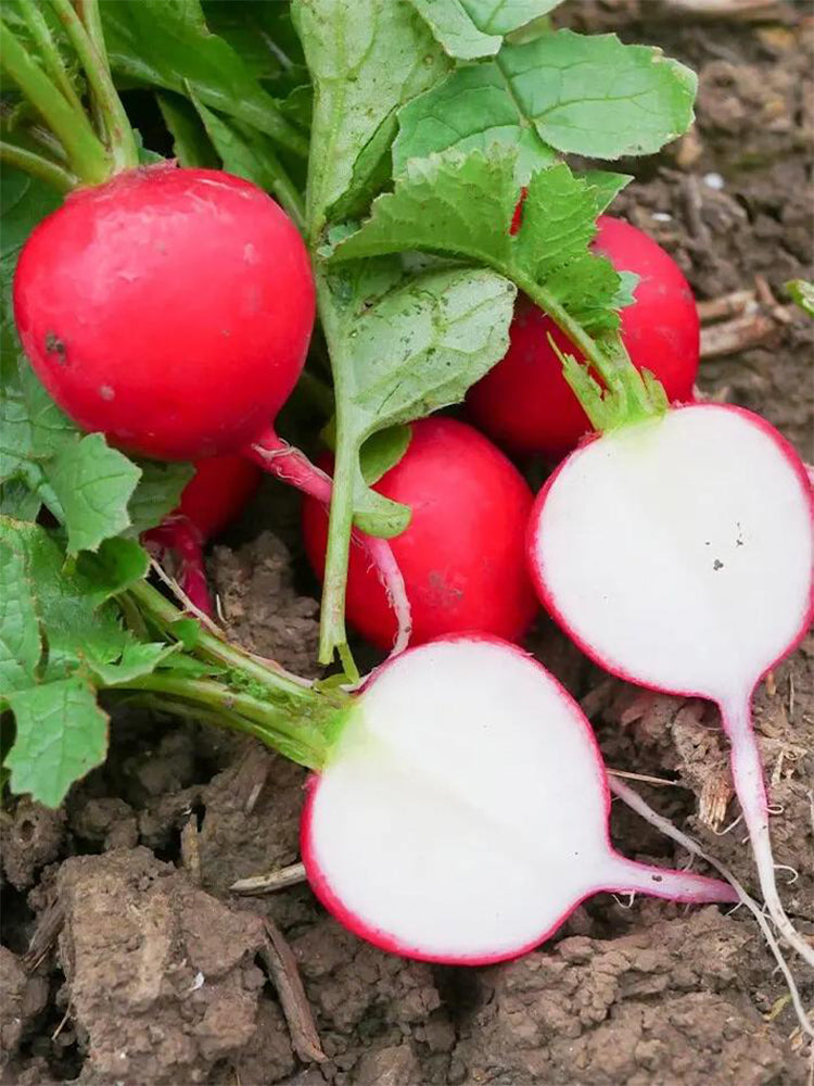- This early-maturing variety exhibits rapid plant growth, with a growth cycle of just 20–30 days. Its leaves are small, upright, and vibrant green, while the roots are uniformly spherical with high harvestability. The skin is a deep red, smooth, and glossy, and the flesh is tender and fine-textured. The variety demonstrates strong heat and moisture tolerance, along with high resistance to viral diseases and downy mildew. It is well-suited for open-field cultivation in spring and autumn, as well as protected cultivation (e.g., small arched tunnels). Moderate-density planting is recommended, and due to its short maturity period, timely harvesting is essential. Under favorable climatic conditions, this variety delivers stable yields and outstanding performance.
