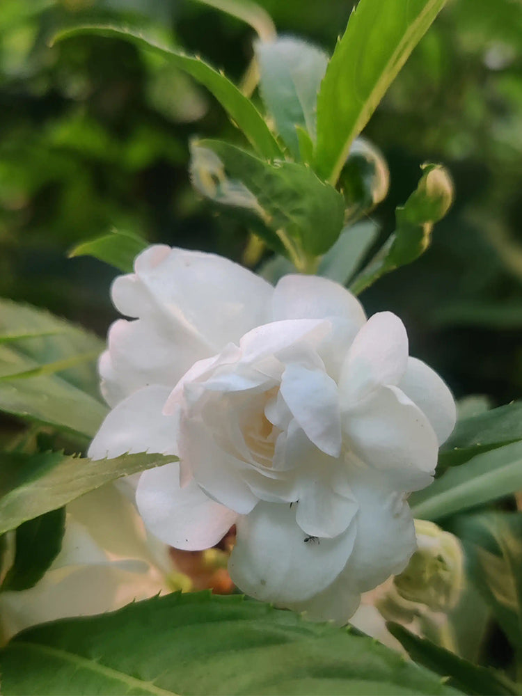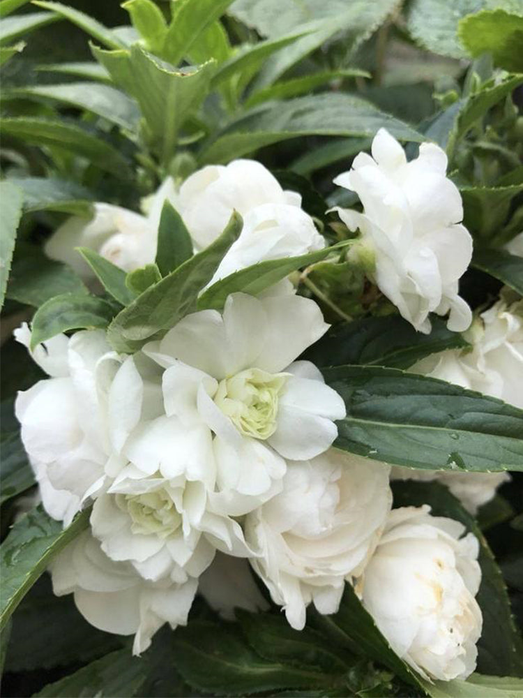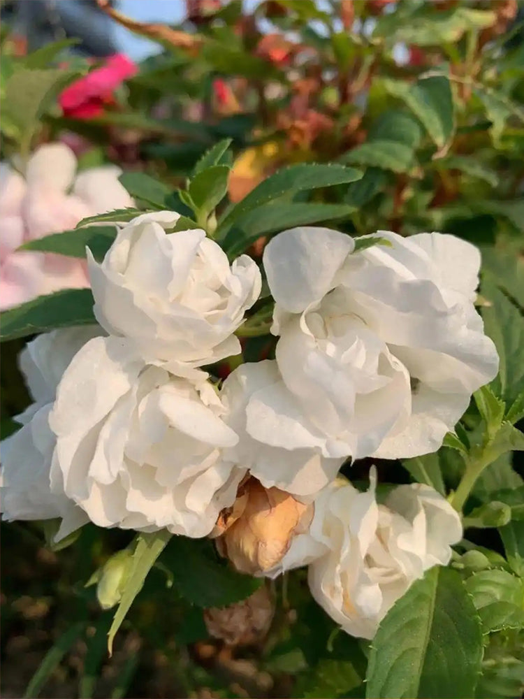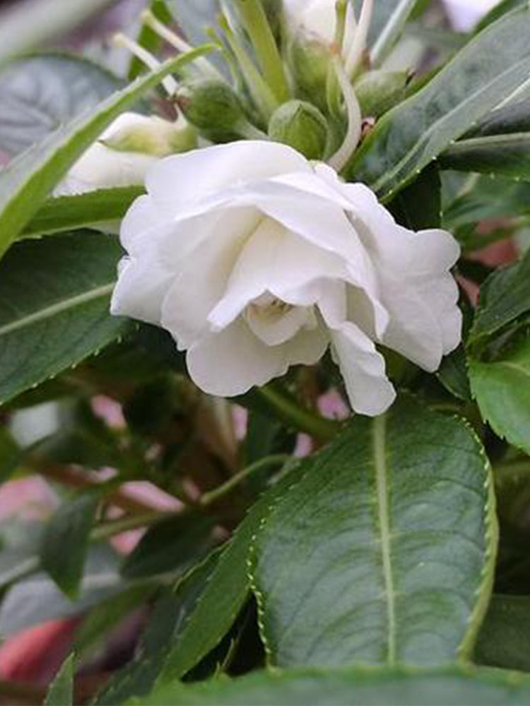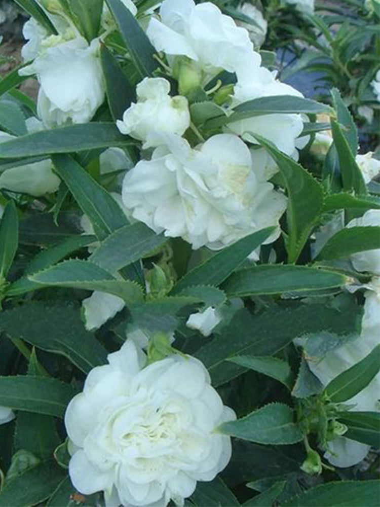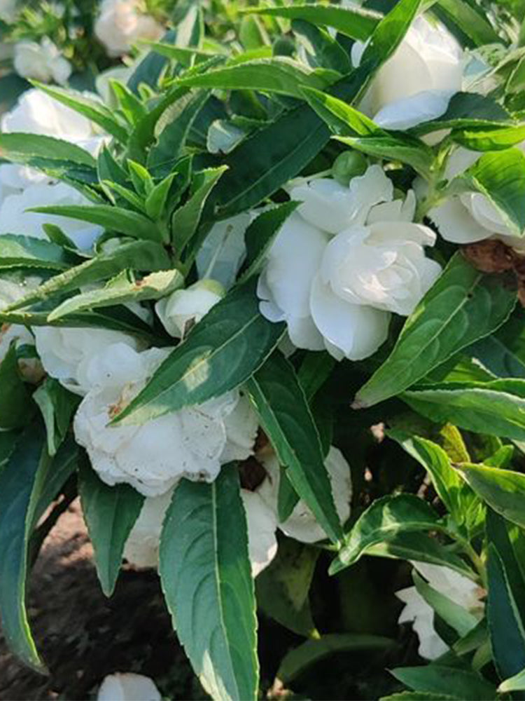 - Garden Balsam Double Flowers (scientific name: Impatiens balsamina L.) is an annual or biennial herbaceous plant in the genus Impatiens of the family Balsaminaceae. It is named for its double flowers that resemble camellias. The plant reaches a height of 25–50 cm, with swollen, smooth, tender, and juicy stem nodes. The leaves are arranged alternately or oppositely, often whorled in the upper parts, with glands between the petioles and no stipules. The flowers are bisexual, zygomorphic, and occur either singly or in clusters in the leaf axils. The large, double, terminal flowers have white petals. This species prefers warm, moist, and sunny conditions. It is not cold-tolerant and is sensitive to high temperatures; appropriate shading is necessary in summer to protect it from strong light. The optimal temperature for seed germination is 22–30°C, and for growth, it is 15–32°C. It thrives best in loose, fertile, sandy soil.