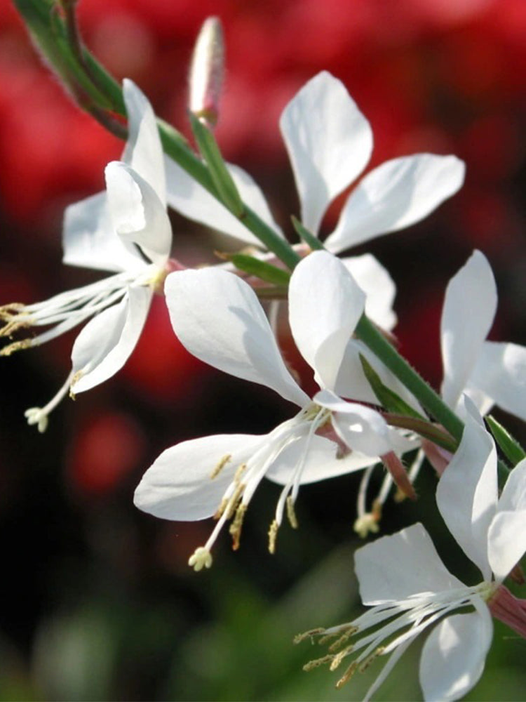 - White Gaura (Gaura lindheimeri) is a highly ornamental perennial herb with an erect and branched stem, and the whole plant is covered with short hairs. Its leaves are alternate, sessile, lanceolate or spoon-shaped, with a gradually pointed tip and wavy, outward-rolled leaf margins. The flowering period is from May to September. The pale pink lanceolate calyx is matched with white petals, which is fresh and elegant. The plant is highly cold-resistant and prefers a cool and semi-humid climate. It adapts to an environment with plenty of sunlight and is also tolerant to semi-shade and low temperatures. It requires fertile, loose and well-drained sandy soil. It is suitable for group planting and can be widely used in flower beds, flower border ground covers, potted plants, lawn embellishments and mass planting in garden green land. It is also an ideal choice for garden greening and high-quality cut flowers.
