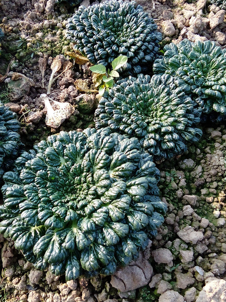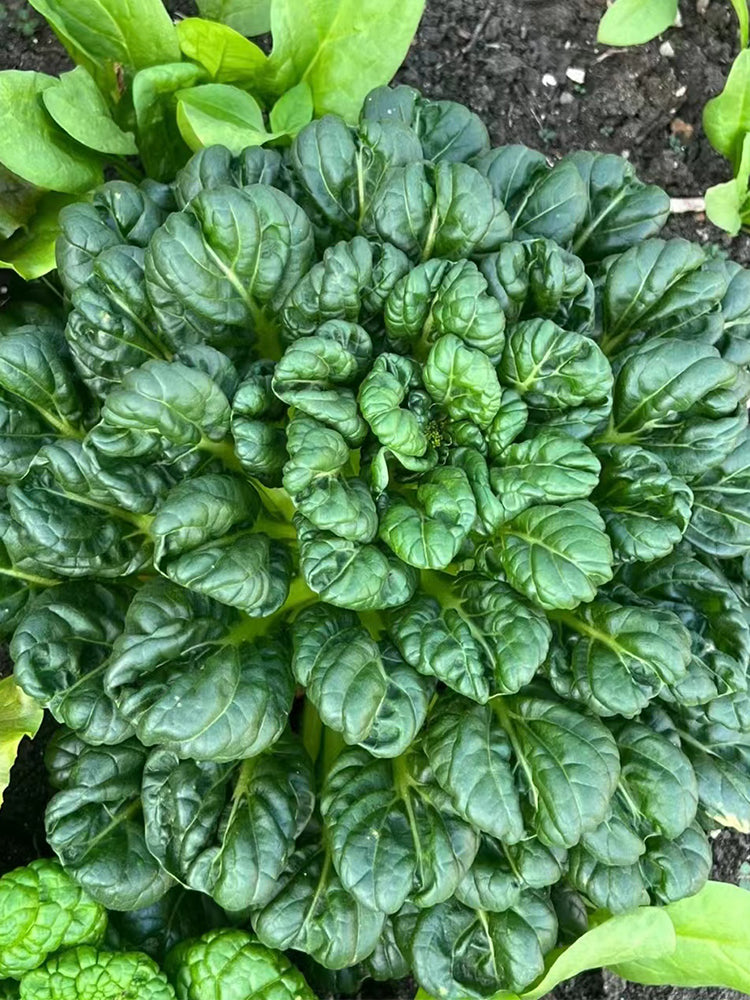 - This variety features a compact, ground-hugging growth habit, with a plant height of approximately 10 cm and a spread of about 30 cm. The leaves are small, dense, oval-shaped, and distinctly wrinkled with a glossy surface. Their edges curl outwards, presenting a dark green color, while the petioles are flat, concave, and bright green. The average weight per plant ranges from 150 to 250 grams. It offers stable yields, with a production capacity of 1000 to 1500 kg per mu, and demonstrates good yield stability and disease resistance. While not heat-tolerant, this variety exhibits excellent cold hardiness. It is characterized by its tender, crisp, and refreshing texture, is rich in nutrients, and is of superior quality.