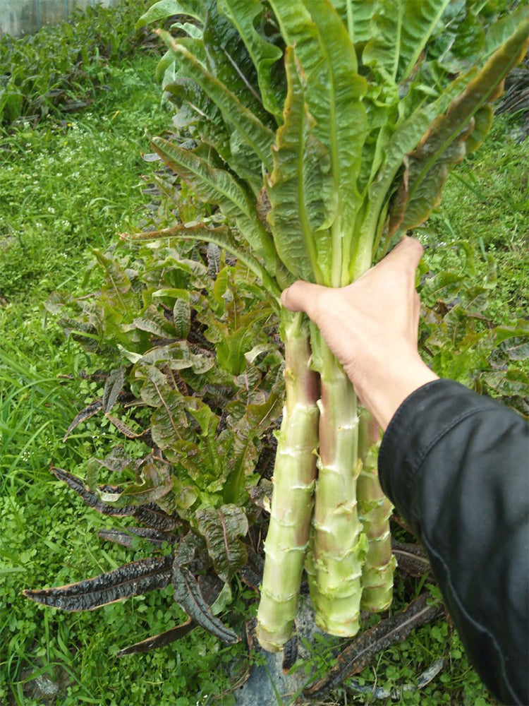 - 'Xiangsihong' Stem Lettuce is a mid-season variety, ready for harvest approximately 80 days after sowing and suitable for spring and autumn cultivation. This variety exhibits vigorous growth, good tolerance to fertilizer, strong disease resistance, and high yield potential. It has a compact plant type, reaching a height of about 70 cm, which allows for moderately dense planting. The leaves are long, lanceolate, purple-green, and crinkled with a pointed tip. The stems are elongated and club-shaped, measuring about 60 cm in length, with an average single-plant weight of approximately 1 kg. The stem flesh is emerald green, crisp, and sweet with a rich fragrance, delivering excellent quality. It possesses high marketability, broad adaptability, and is well-suited for large-scale cultivation.