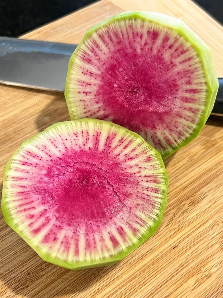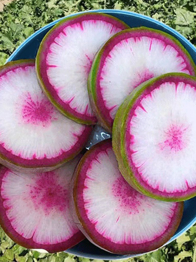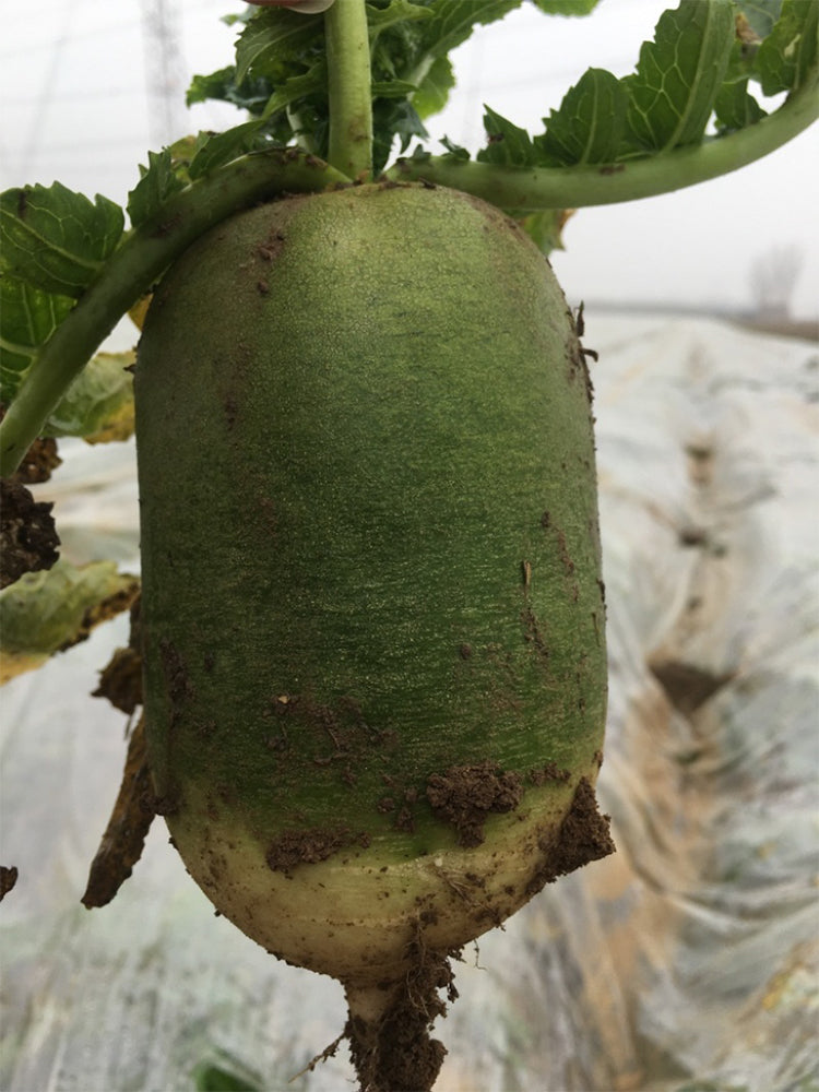 - This product is an F1 hybrid fruit-type "Xinlimei" autumn radish variety. The fleshy root is short cylindrical in shape, with an average single root weight of approximately 600 g (up to 800 g maximum). With emerald-green skin and vibrant purple-red flesh, it features a crisp, juicy texture, remarkably sweet flavor, and excellent eating quality. The roots have an attractive appearance and superior marketability. With a growth cycle of about 80 days, this variety shows strong adaptability. Notably, delayed sowing (instead of early sowing) can significantly enhance sweetness and improve sensory qualities, making it an ideal choice for premium fresh-eating radish production.