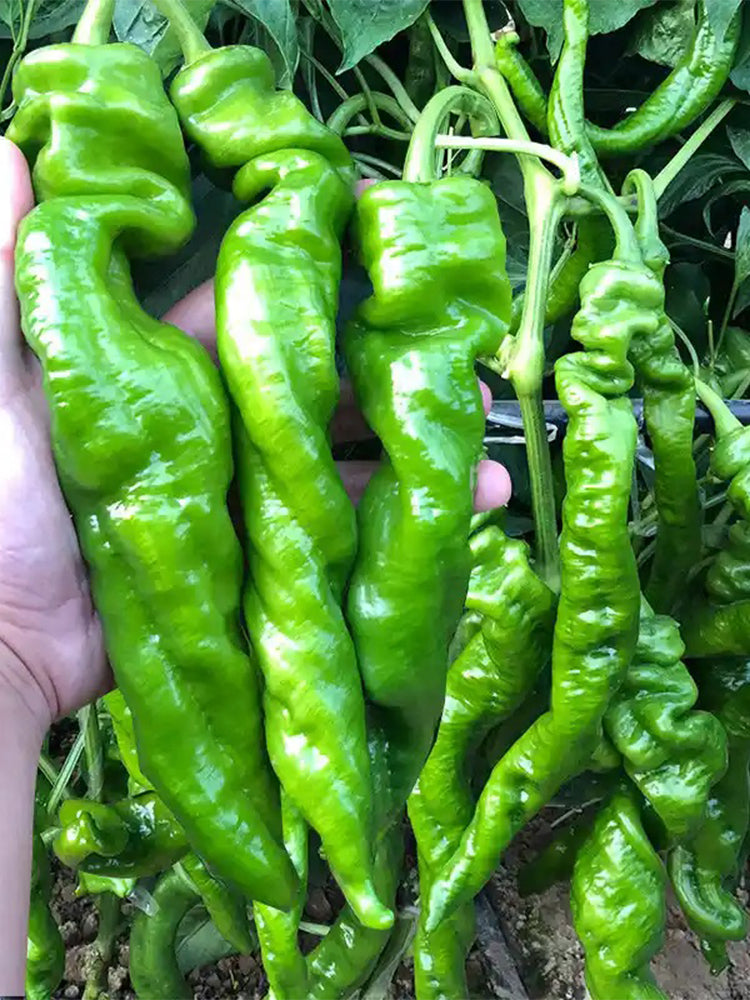 - This variety can be harvested approximately 35 days after transplanting. The fruit is horn-shaped with wrinkles and spiral patterns on the surface, green in color and with strong pungency. The flesh is about 0.3 cm thick; the fruit is 25–35 cm long, 3–4 cm in diameter, and weighs 60–100 grams per fruit. It has good storage and transportation tolerance and excellent marketability. When grown in suitable regions and seasons, this variety shows strong disease resistance and high yield.